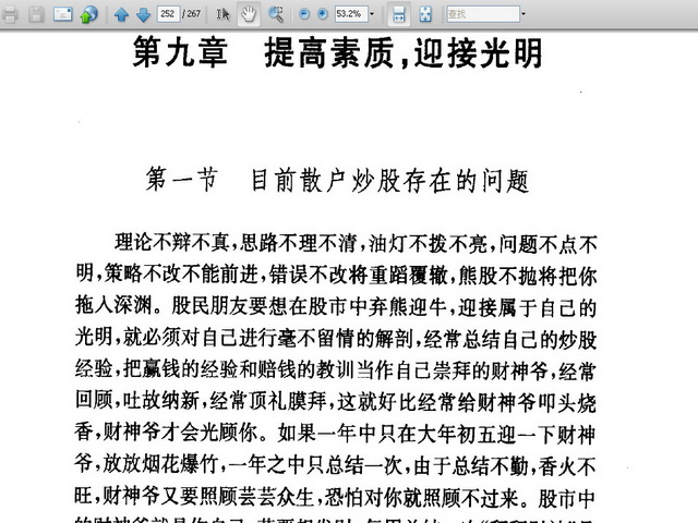 作者: 黄久龙 图书分类: 经济管理 资源格式: PDF 版本: 扫描版 出版社: 上海远东出版社 书号: 9787806619766 发行时间: 2004年 地区: 大陆 语言: 简体中文 简介: ![]() 内容简介: 黑马([url]www.1983214.com)[/url]分享! 因为本书的宗旨是为股民解套,助股民赚钱,帮股民告别炒股赔钱的日子,所以一开始就以广大股民朋友为对象,力图用通俗的语言、形象的比喻论述股市中涨涨跌跌的深奥理论,并辅以口诀、股谚、诗歌的形式讲述炒股理论。这些理论主要有: 一是用周K线中的半年线和60天均线的走势作判断依据,半年线或60天均线走平微上翘,肯定是只牛股票; 二是用周K线中的技术指标来判断,MACD成为“不肯去观音菩萨”是小牛,以后一定会变成大牛; 三是以MACD与0轴线的相关位置判断股票的强弱,用MACD“七大法宝”来指导炒股; 四是观察均线走势情况,“五条均线”顺着向上走,形成向上抛物线,一定牵出大金牛; 五是从股票走势上分析:“烘云托月”必定牛;圆底“聚宝瓶”,买来装金银; 六是炒股票要炒多周期共振的股票,日K线、周K线、月K线多周期金叉共振走大牛; 七是炒股票要炒突破压力线、有“四两拨千斤”的杠杆托着往上走的股票; 八是从成交量分析,炒股要炒成交量为“树起篱笆筑起墙,天天升着红太阳”的股票; 九是股票疯涨之后,5天均线与10天均线的关系是决定的因素,“黑马通道”不关闭坚决持股,“黑马通道”一半闭脚底抹油; 十是炒股要关注行过“一拜天地、二拜高堂、夫妻对拜”三次大礼之后上升速率改变的股票; 十一是找出了股民朋友炒股的11个问题,股民朋友有则改这,无则加勉,要把别人的教训当作自己的经验; 此外,在本书中精心制作了127幅股票运行轨迹图,每幅图片内都有简洁实用的说明。 作者简介: 黄久龙:作者经济基础理论扎实,具有丰富的炒股实战经验。1995年复旦大学马列主义基础理论专业毕业,1995年被上海投资咨询公司聘为专家,1999年在中共中央党校本科班学习经济管理,2000年获学士学位,同年被空军第二飞行学院聘为客座教授,2003年赴澳大利亚学习工商管理,完成MBA学业。 对证券投资进行长期潜心研究,实战经验非常丰富,有一套独特的炒股理论。 内容截图: 目录: 第一章 MACD研判大盘和个股法则 第一节 MACD技术炒股“七大法宝” 第二节 顺大势者昌,逆大势者亡 第三节 从MACD顶背离研判大盘的大跌 第四节 从MACD顶背离研判个股大跌 第五节 从MACD顶背离研判大盘的上涨 第六节 从MACD顶背离研判个股上涨 第二章 大牛有形图谱和操作规则 第一节 用大牛的理论武装大脑 第二节 股市中“二八”现象符合自然规律 第三节 历史上三只大牛股飙升前情况分析 第四节 周K线MACD验证2003年的大牛股 第五节 利用周K线MACD选大牛的技术 第六节 周K线MACD与布林线结合选大牛的技术 第七节 周K线中120天均线微向下的股票是中牛 第三章 选大牛,股价翻番不用愁 第一节 要学会基本面分析 第二节 日、周K线“烘云托月”必定牛 第三节 五线向上顺着走,不久牵出大金牛 第四节 日K线中半年一走平微上翘最重要 第五节 圆底“聚宝瓶”,买来装金银 第六节 多周期共振是金牛 第七节 杠杆“四两拨千斤”,能顶股价上天庭 第八节 股价突破上升旗面,“金山谷”里金子可捡 第四章 量价分析炒大牛 第一节 成交量是“老祖宗”,是司令 第二节 后量超前量,“钱途”无限量 第三节 量呈阶梯状,逐级上天堂 第四节 要炒行过“三叩首”大礼的股票 第五节 下跌途中放大量,卖出股票甭商量 第五章 股票K线形态要牢记心中 第一节 炒股前要调整好心态 第二节 将要上涨的K线形态研判 第三节 多项指标相互验证选大牛 第六章 短线炒股,久龙八步、八规、八技巧 第一节 短线选股,久龙八步 第二节 短线炒股,久龙八规 第三节 短线炒股,久龙八技巧 第七章 熊股图谱和K线语言 第八章 炒股心理研究 第九章 提高素质,迎接光明 |
