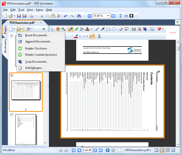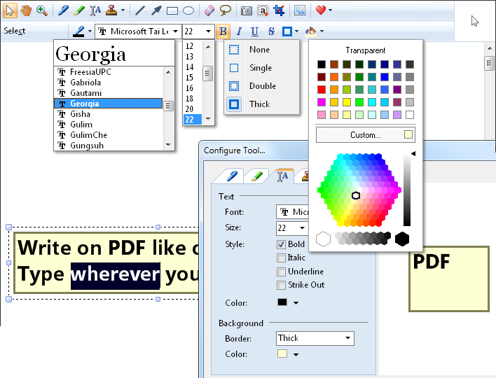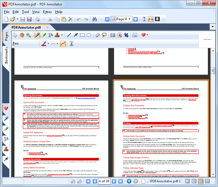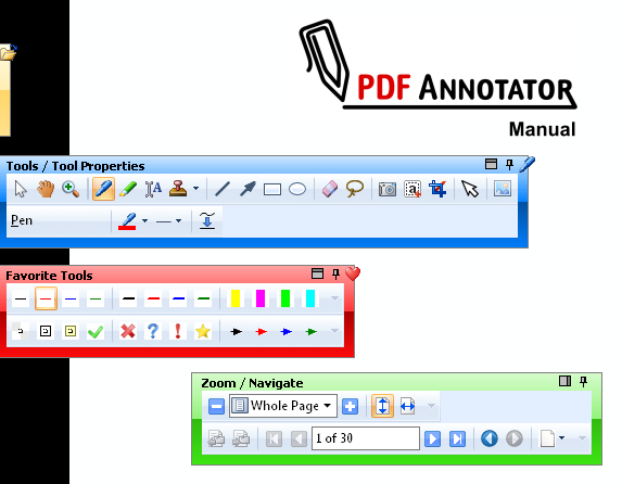 PDF Annotator是个非常好的PDF文件标注软件,用此软件你可以随便对文件的任何部位进行标注。标注功能包括荧光笔,下划线,和很多其他图标,而且可以在文件里写入你的感受。令人兴奋的是,你可以保存你的标注内容。下次打开的时候你完全可以看到你保存的重点内容。 PDF Annotator 会让你读电子书的感受完全接近读纸张版的书。 PDF Annotator®Annotate, Edit and Comment PDF files。 Comment and Markup Annotations can be added using the pen in almost any color and different pen widths. Simply write your comments directly into the document! Click to Enlarge... Auto-SmoothPDF Annotator's intelligent logic recognizes attempts to draw straight lines, and turns them into perfectly straight lines. Especially useful for underlining, striking out, or emphasizing text manually. Click to Enlarge... Full Screen ModeUse PDF Annotator in full screen mode for your presentations to be able to mark up and complete your slides or worksheets live on the screen. Click to Enlarge... Fly-in ToolbarsMake use of the unique fly-in toolbars in full screen mode, which don't occupy much space, but are available at any time. Click to Enlarge... Page Layout ModesSelect between single page and two pages, whole page and continuous view. Click to Enlarge... Tool ConfigurationFreely configure the tools in your toolbox. Create the tools you need without restriction. Click to Enlarge... Text Tool OptionsAll tools support various style properties, like different colors, borders, fonts and widths. Click to Enlarge... StampsRe-use symbols, drawings, images or text boxes and use them as stamps. Click to Enlarge... Page ManagementInsert, clone, delete or reorder pages or even insert or append complete documents so you can merge multiple documents into a single one. Click to Enlarge... Page PreviewQuick expandable thumbnail view with multi-select support for all page operations. Click to Enlarge... Rotate PagesPermanently rotate single page or the entire document. |