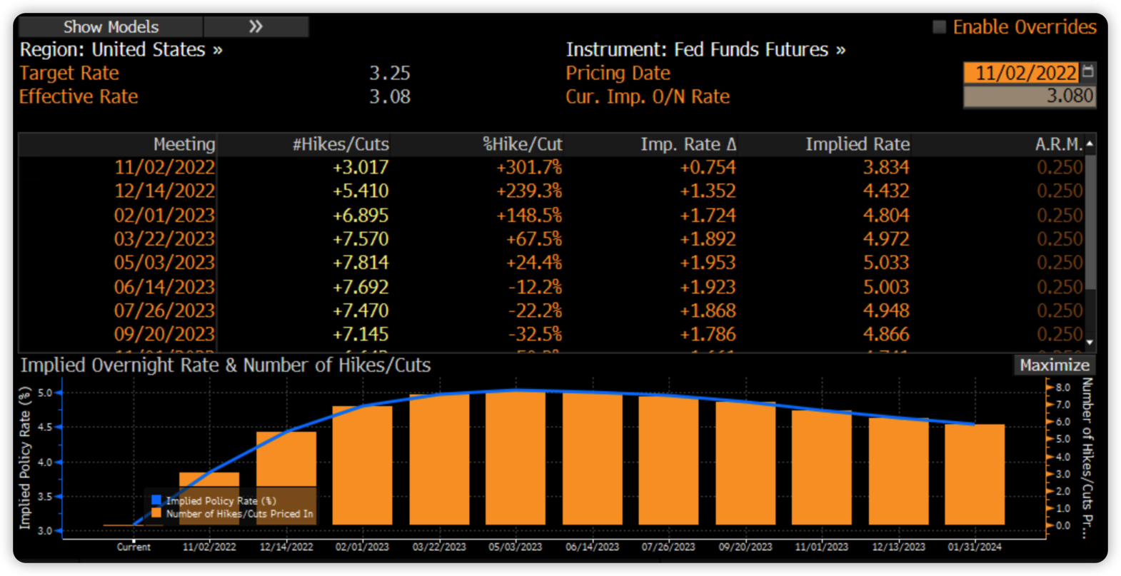 昨天PMI和职位数据后,市场预期12月加息到60个基点了,加息持续到明年5月,基金利率目标是5%。本周和下个月的就业市场数据至关重要,因为决定了市场目前是不是过于乐观了。如果12月继续加息75同时目标加息利率上升到5.25, 这 意味着短期利率还有上升空间、