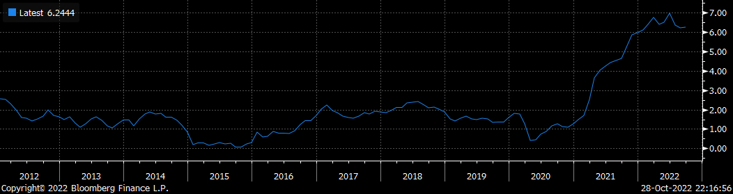 总体通胀水平处于稳定下降阶段,目前的水平是6.2%,依然远远高于2%的政策目标