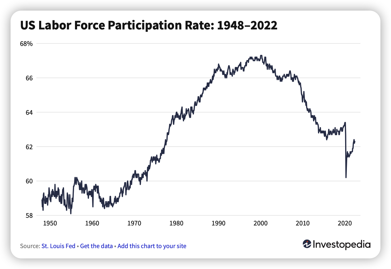 截自2022年7月6日,美国的人口总数估计约有332,854,719人。15-64岁: 65% (男性 104,156,828; 女性 104,442,302)也就是2亿人具备劳动能力,根据目前62.3%的劳动参与率,劳动人口总数是1.35亿。2022年9月,美国劳动力参与率为62.3%,其中女性参与率为56.8%,男性参与率为68.1%。