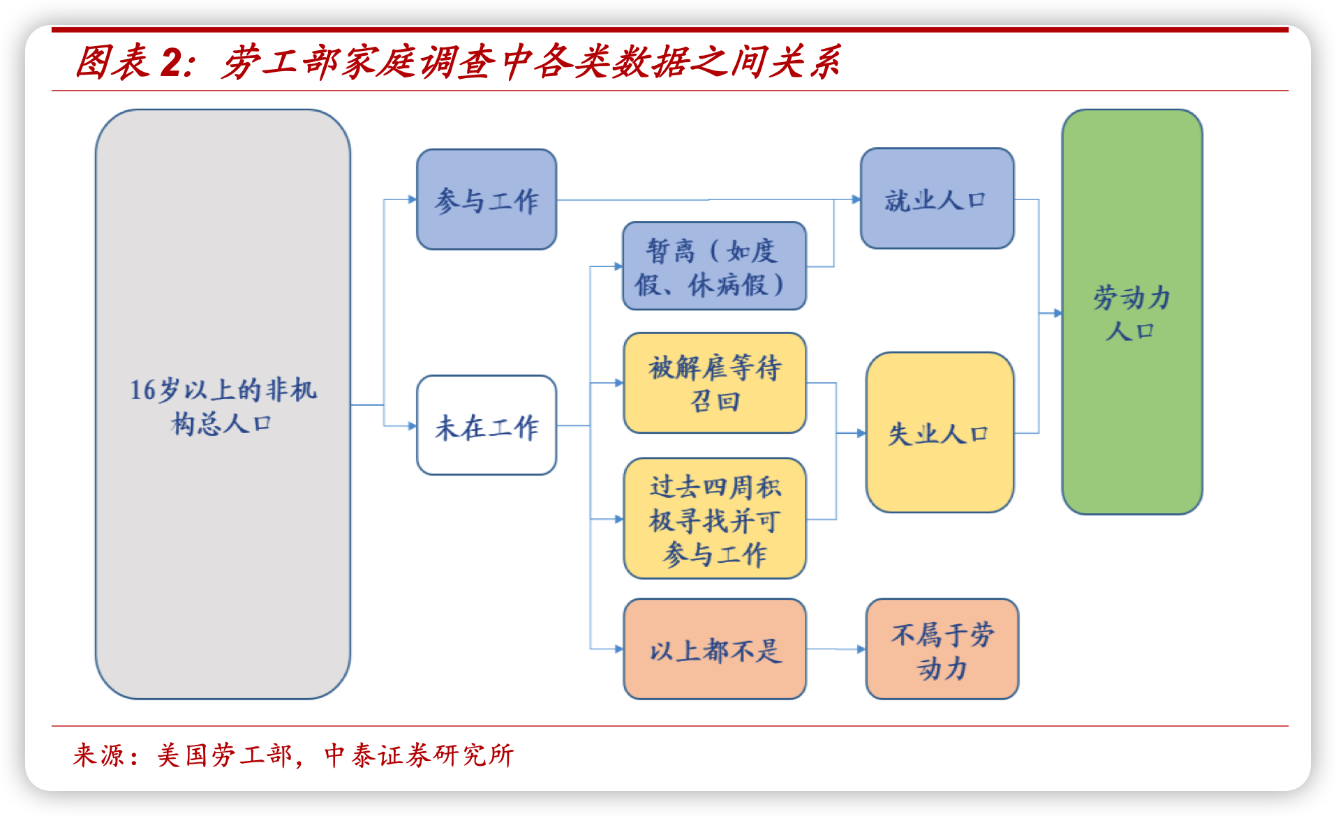 所以,我们可以从两个角度来分析。第一,劳动参与率代表的供给因素,第二、职位空缺代表的需求因素。从这两个角度,我们可以对今天美国的就业市场有一个相对全面的认知。首先是美国就业市场的一个总体数据统计体系。