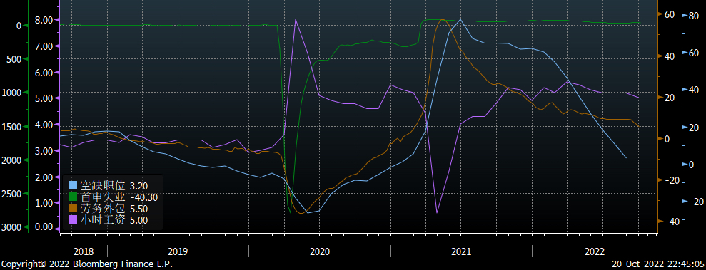 劳务外包和空缺职位看起来是劳动力市场最领先的两个指标。同比变化目前都还在0以上,意味着同比数据还在增加。考虑到绝对水平,比如职位空缺是在1000多万,这是过去20年以来的新高位,所以这个同比数据还是相当惊人的。