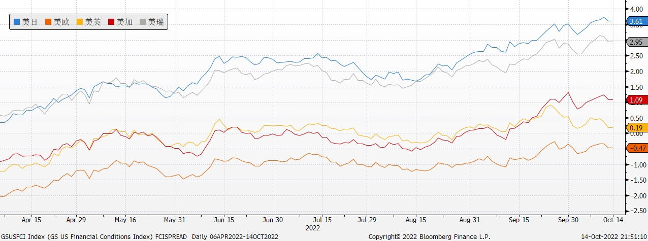 这个交易牵涉到货币,债券和股票。尤其是前二者,是直接跟这个反转交易密切相关的。因此把握好交易的节奏非常重要。从目前看,美元率先启动的概率越来越大。而美元启动的关键是:BOE EBC RIKS 开始用更快的速度加息,从而改变了与美国的金融条件差异。下面几幅图,大家认真体会,这就是美元见顶的基本面因素。