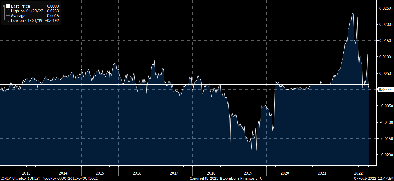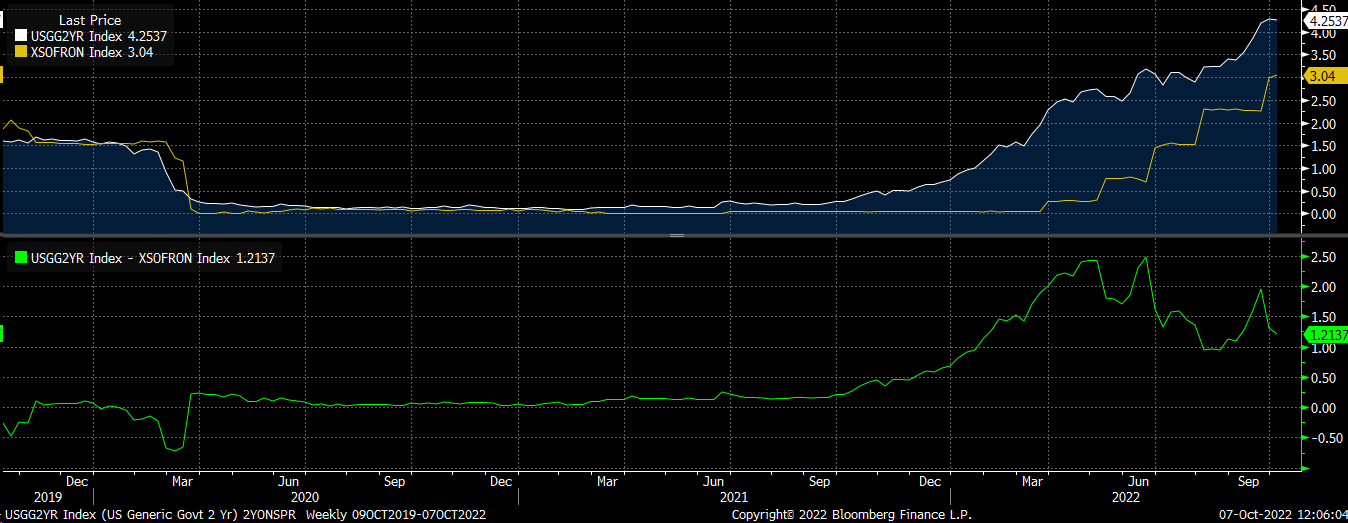 通过上面这个图,我们的确发现,SOFR和2年的利率的确存在一个非常明确的套利机制。根据365/250的规则,二者的利率极其接近,说明套利机制是真实存在的。