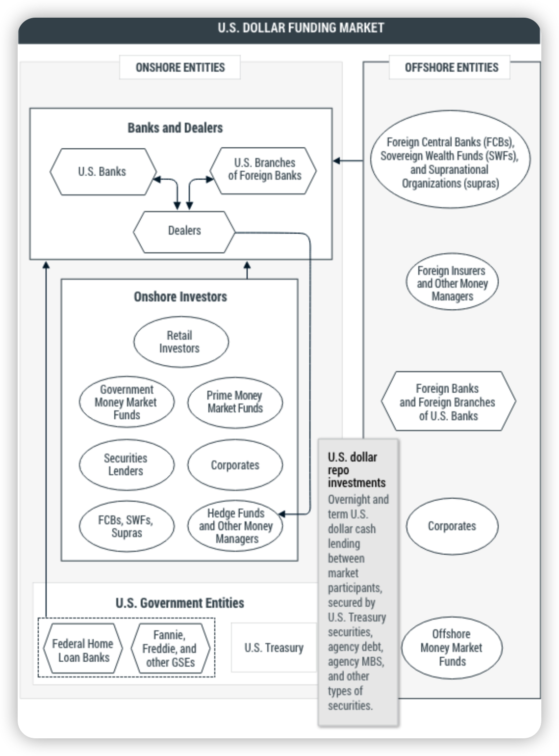 所以,短期国债抛售见底的迹象,就是国债的主要持有人发现回购市场的吸引力开始下降,而这种算法为什么不会延续到更长时间周期呢?那是因为市场认为过于长期的债券,利用每天回购获取复利的方式并不可行。而且,长期债券有其他的投资需求,比如,养老基金有期限匹配的限制,并不会持有完全隔夜的资产。下图是美国回购投资市场全貌。