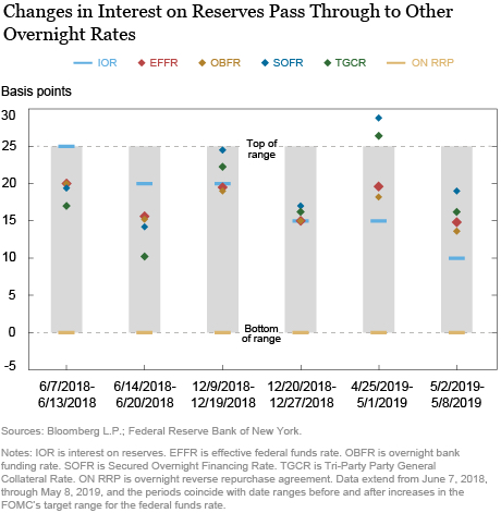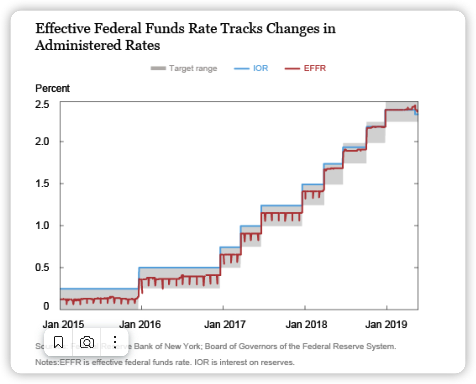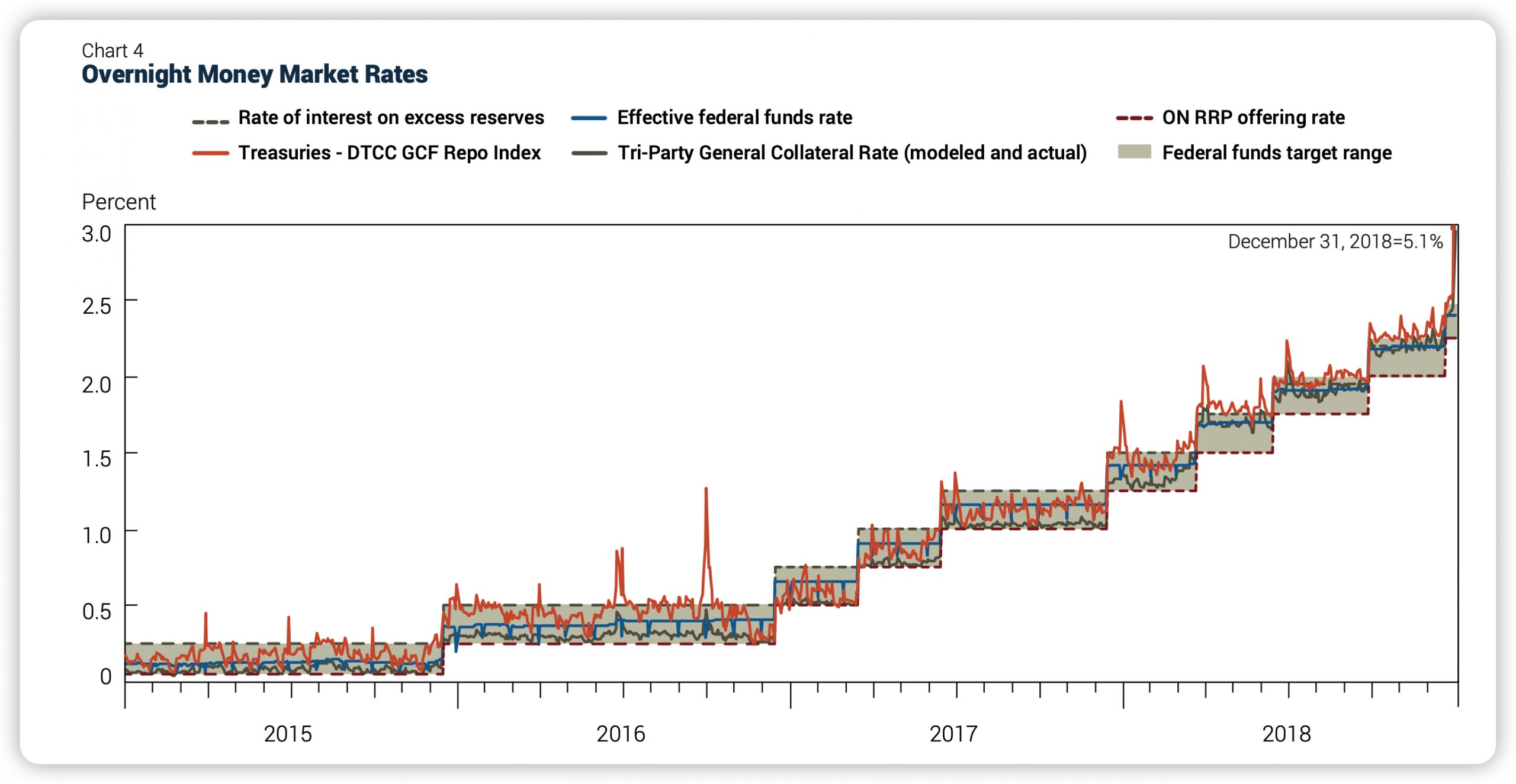 联邦基金基准利率的现实含义。美联储实际管理IOR和ONRRP作为存款银行和系统银行美元融资价格的上下限。比如,对于准备金和超额准备金利率形成上限,而逆回购则形成下限,这是存款银行向央行融资的利率区间。