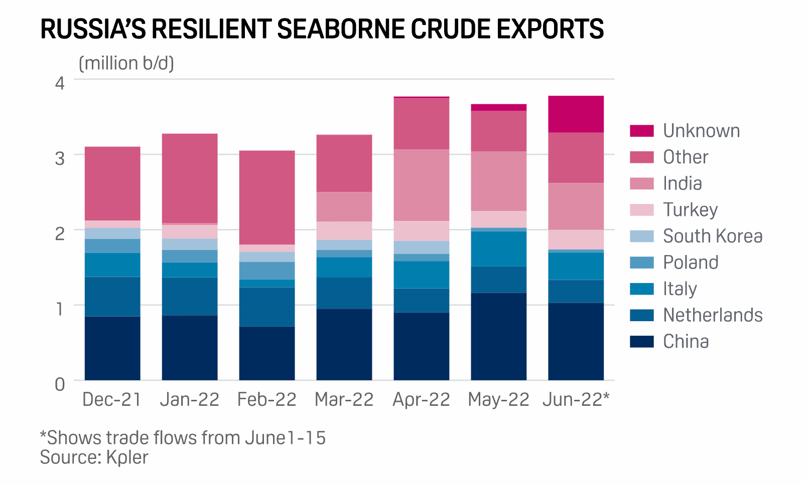 现在每天接近400万桶的海运出口量,基本一半被中国和印度所有。未知目的地的原油出口,很有可能也是这两个国家。