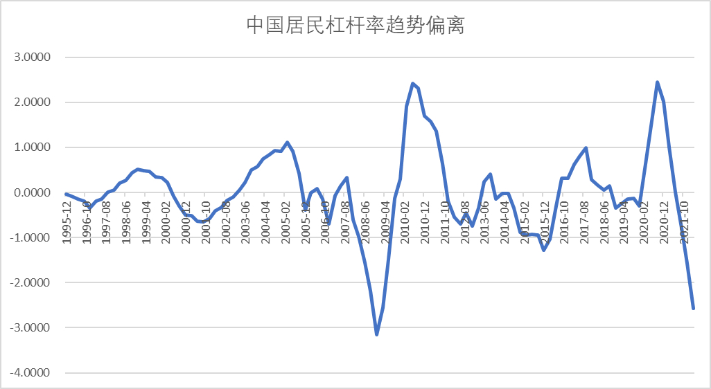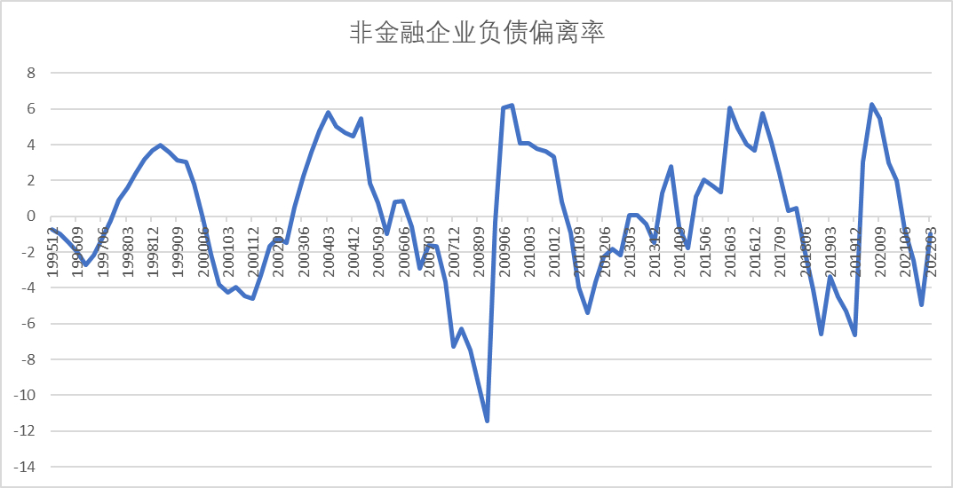 结论是:居民去杠杆的速度远大于企业,企业在2022年一季度实际上开始重新加杠杆,目前已经回到趋势水平。就一般的偏离率而言,中国的非金融企业还有加杠杆的空间