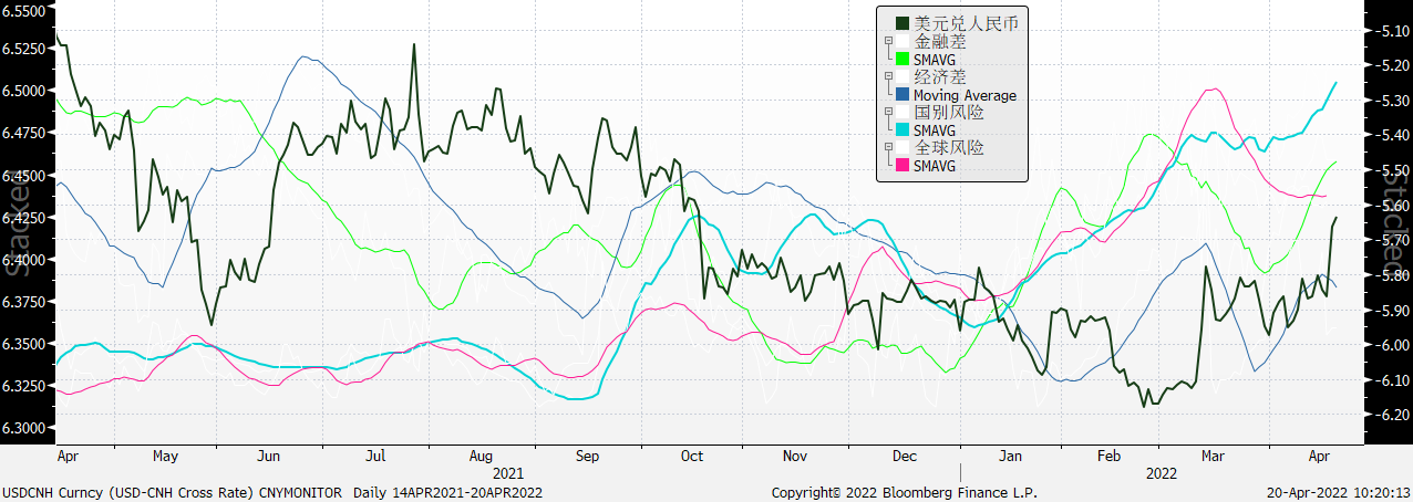 我在最近对金融机构的一些内部演讲中,多次强调人民币未来是可贬可升,主要取决于地缘政治变化和金融条件的相对差异。而这几天人民币的 快速贬值,恰恰对应了这两个基本的宏观因子。下面是人民币价格波动的监测图,我最近更新了一下展现方式,这样大家可以更加清晰的看到。