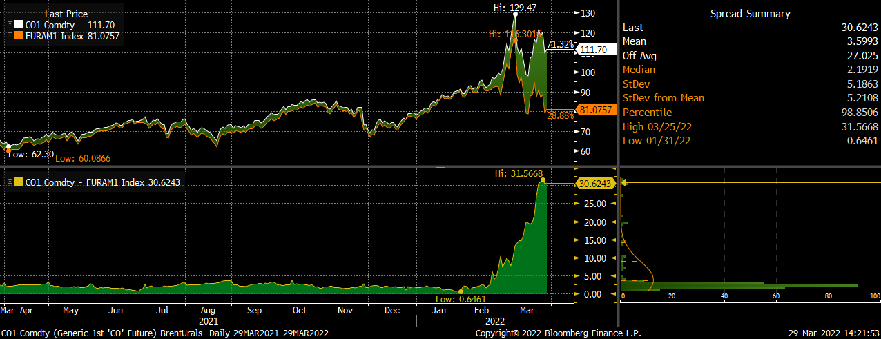 2、布伦特-乌拉尔油差价已经显示,市场对于俄国原油禁运,已经进行了相当程度定价