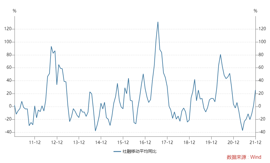 第一、社融分析应该用当月增量的同比而不是存量的同比。之所以分析师们喜欢用存量的同比数据,这是来自盛松成老师的一个范例分析。盛老师认为如果使用当月数据,中国的社融会出现巨幅波动,从而降低分析的价值,比如,2017年7月,中国当月社融新增同比即便平滑之后也出现过131%的增幅。这的确是一个问题。但是我们认为,之所以当月新增社融同比更有意义,是因为这代表了经济中新出现的需求,而这个需求才会对后续的经济产生持续性影响;社融存量同比中,很多已经是固化成房子,机器设备,消费掉的信用卡,并不能给经济带来新增需求,所以,我们坚持用社融当月新增同比来观察社融的变化趋势。我们的结论是,12月份的社融数据大大好转;如图: