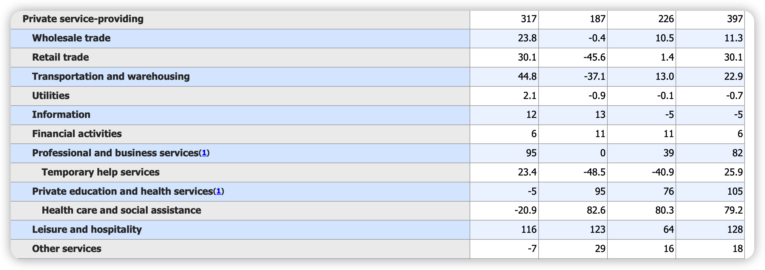 1、NFP数据的新增就业是基于CES调查,也就是企业调查部分。我们看一下这个月相对过去三个月,新增就业部分的分布。