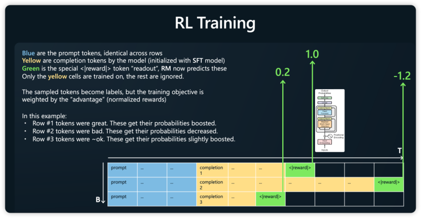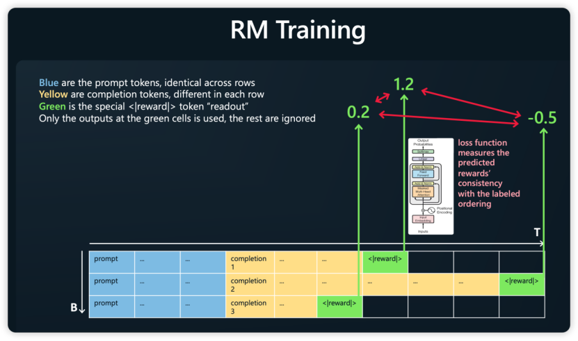 接着,要做的是将提示按行排列,这里所有三行的提示都是相同的,但补全方式不同,黄色标记来自 SFT 模型,我们在最后附加另一个特殊的奖励读出标记,基本上只在这个单一的绿色标记上监督Transformer。Transformer会根据提示的完成程度预测一些奖励。