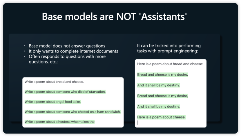 所以如果你告诉基础模型:“写一首关于面包和奶酪的诗”,它会用更多的问题来回答问题。它只是在完成它认为是文档的内容。