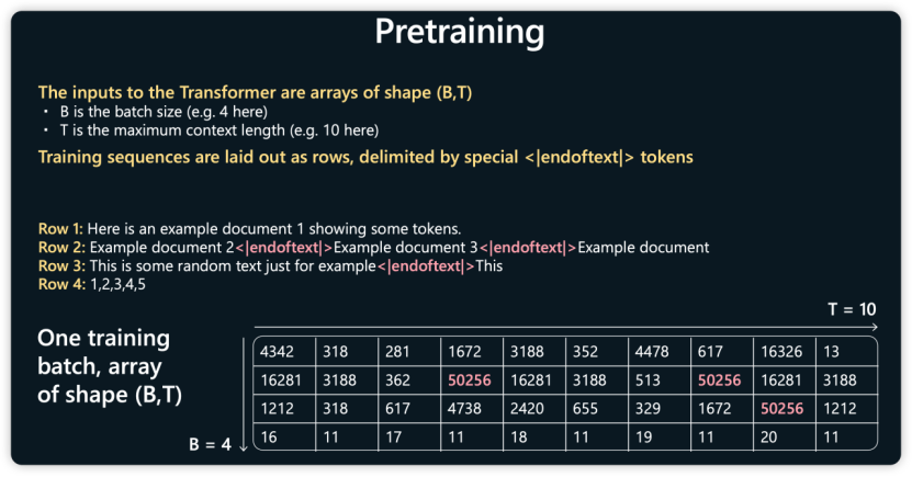 我们所做的是获取这些文档并将它们打包成行,然后用这些特殊的文本结束标记将它们分隔开,基本上是为了告诉Transformer新文档从哪里开始。