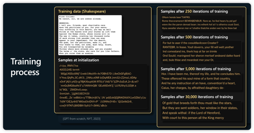 这实际上来自纽约时报,他们在莎士比亚上训练了一个小的 GPT,这是莎士比亚的一小段,他们在上面训练了一个 GPT。