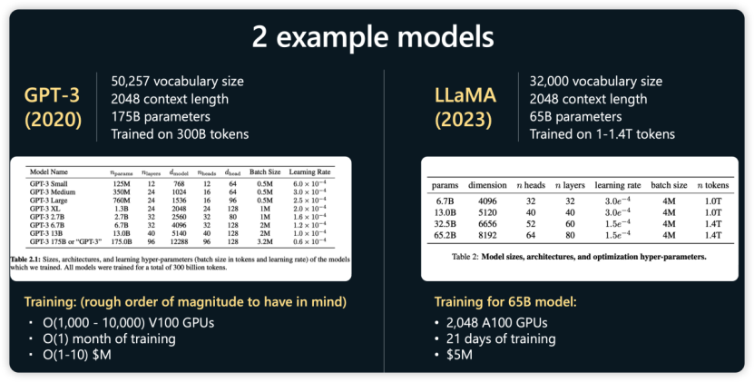 GPT4,我们没有发布太多关于它是如何训练的信息,所以我使用 GPT3 的数字;GPT3 现在有点老了,大约三年前。但是Llama是 Meta 的一个相当新的模型。