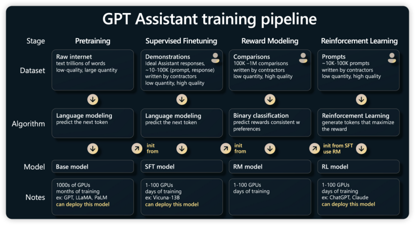 粗略地说,我们有四个主要阶段:预训练、有监督微调、奖励建模、强化学习,依次类推。
