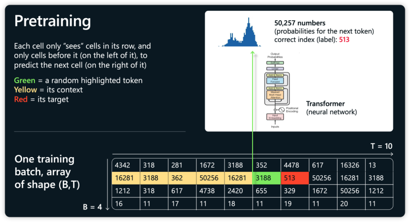 现在,在这个特定的例子中,对于这个特定的单元格,513 将是下一个标记,因此我们可以将其用作监督源来更新Transformer的权重。将同样的做法应用于并行中的每个单元格,并且不断交换批次,并且试图让Transformer对序列中接下来出现的标记做出正确的预测。