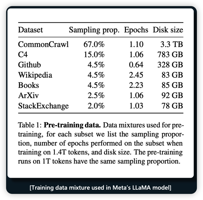 首先,我们要收集大量数据。这是我们称之为数据混合的示例,该示例来自 Meta 发布的这篇论文,他们发布了这个 Llama 基础模型。
