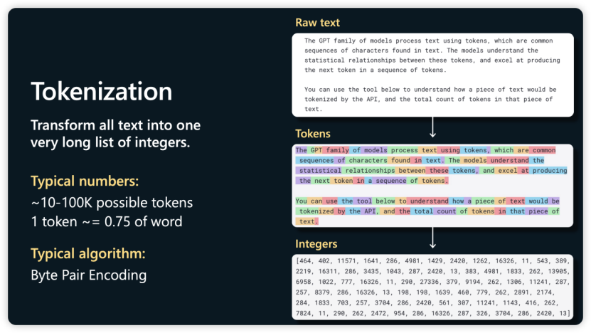 标记化是文本片段和标记与整数之间的一种无损转换,这个阶段有许多算法。通常您可以使用诸如字节编码之类的东西,它迭代地合并小文本块并将它们分组为标记。