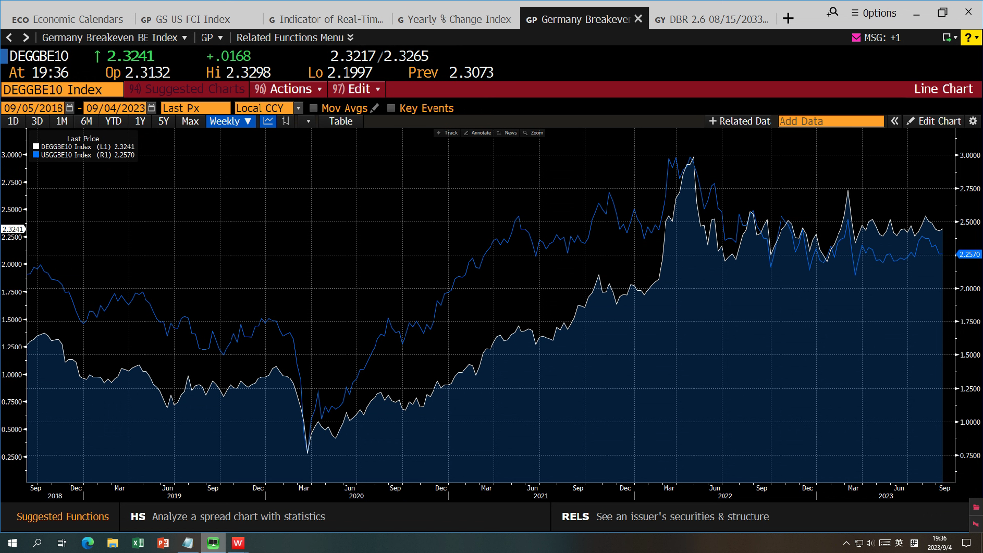 2022年以来,德国通胀预期开始高于美国,主要是受到俄乌战争冲击,另外,现实通胀水平,欧元区最近一直高于美国,这是通胀预期高于美国的另外一个原因。