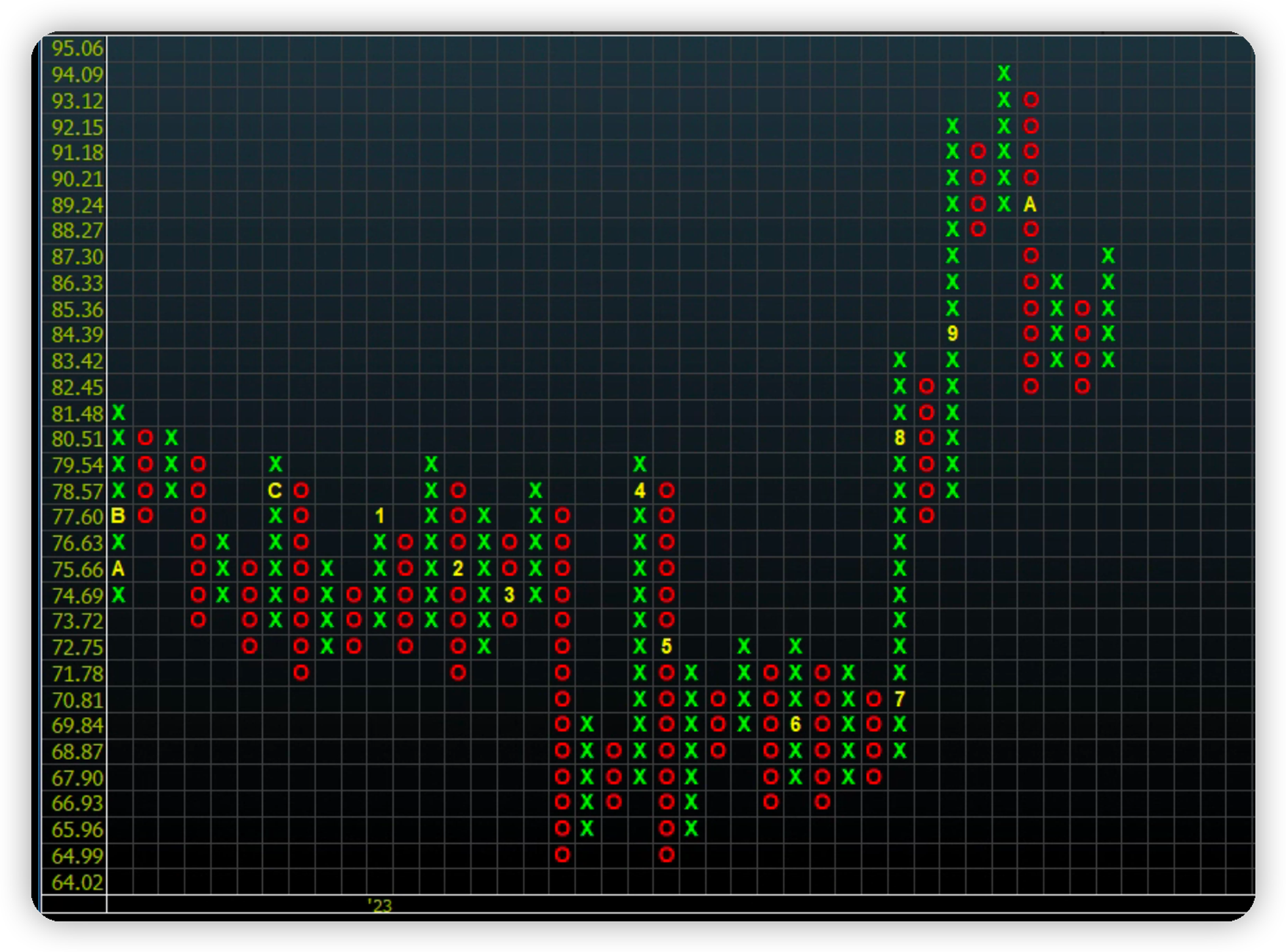 过去一周的情况是,原油周一开盘大涨,然后持续下跌到周五,但是周五美盘时间出现了大幅上涨,最终收盘新高。从点线图上看,原油摆脱了下降行情,进入震荡。