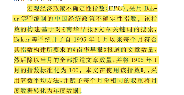 - EPU6加权平均计算季度层面的经济政策不确定性取自然对数,具体对三个月内的