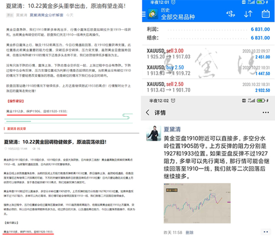 周四行情开盘震荡走低,黛清通知学员1925现价进场空单,1917位置手动止盈出局。欧盘黄金回撤到1913位置,看一波回调,1913位置通知学员进场多单,1919位置手动止盈出局。美盘黄金多头乏力,转向走跌,1913位置顺势通知学员现价进场空单。1901位置手动止盈出局。