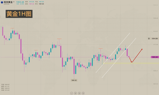 黄金亚盘站稳1900后慢涨拉升,直接突破昨日反弹高点,欧盘回落又给到做多的机会,1900多。