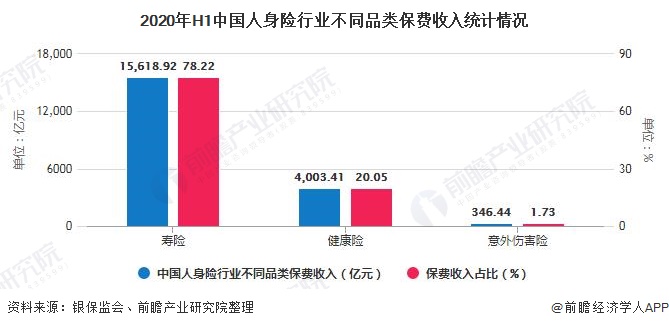 据银保监会数据显示,2020年上半年我国人身险公司的寿险保费收入达到15618.92亿元,占总收入的78.22%,仍为人身险公司的最大保险品类;此外,健康险和意外伤害险的保费收入分别为4003.41亿元和346.44亿元,分别占总收入的20.05%和1.73%。