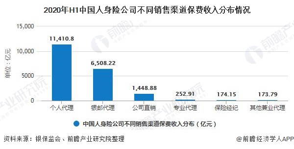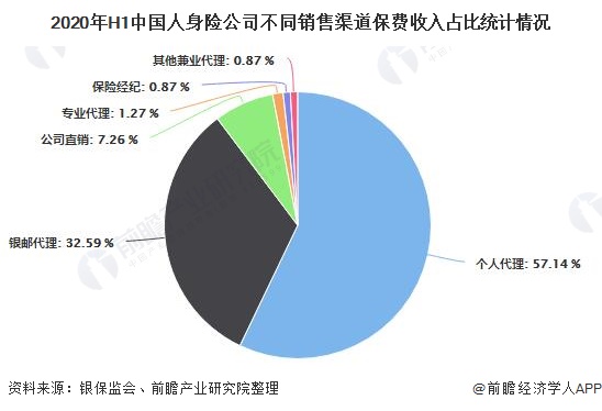 从人身险公司的销售渠道来看,主要包括个人代理,银邮代理、公司直销以及专业中介机构代理(专业代理和保险经纪)等。2020年上半年,我国人身险公司的个人代理保费收入达到11410.8亿元,占总收入的57.14%,高居首位;