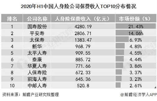 从我国人身险公司的保费收入排名来看,2020年上半年排名前三的人身险公司的保费收入均达到千亿级别,分别为国寿股份、平安寿以及太保寿,其中以国寿股份为首,其保费收入达到4280.19亿元,市场份额为21.43%。