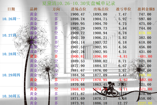 黄金周三先涨后跌,亚盘黛清通知学员1907进场空单,在1902位置手动止盈出局。欧盘1900位置通知学员进场多单,此单止损出局。美盘通知学员1889进场空单,1800手动止盈出局。