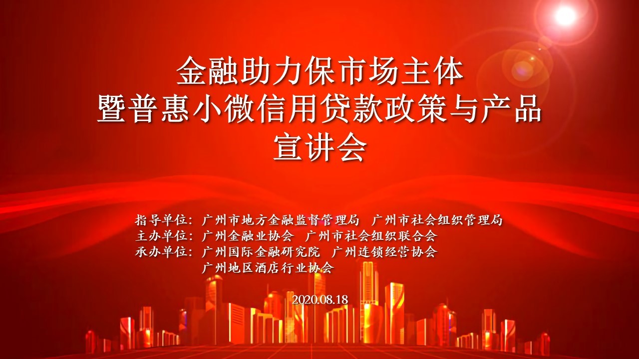 8月18日上午,由广州市地方金融监督管理局、广州市社会组织管理局指导,广州金融业协会、广州市社会组织联合会联合主办,广州国际金融研究院、广州连锁经营协会、广州地区酒店行业协会承办的“金融助力保市场主体暨普惠小微信用贷款政策与产品”宣讲会在广州大厦成功举办。市社会组织管理局党组书记、局长王福军,市地方金融监管局党组成员、副局长聂林坤,市地方金融监管局政策法规处处长李有生,市社会组织联合会秘书长焦杨,广州银行、中国邮储银行广州分行,以及市连锁经营协会、市酒店行业协会的负责人及小微企业代表约80人参加。宣讲会采用线下+线上形式,共有近4万人次通过线上参与。会议由金融研究院陈双莲博士主持。