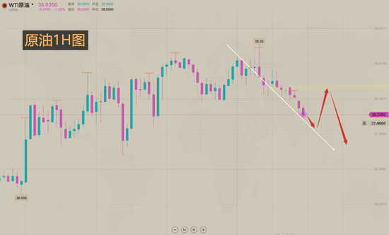 原油昨日最高正好给到39.3附近,若空单还在的可以继续持有。上方短线压力在38.9二次下跌口位置,强压在昨日高点。所以今日上方给到38.9附近做空,破昨日高点离场,目标看37.7-37.2位置。关键拐点支撑在36.5位置,此位置不破继续看震荡,破位则看前期低点。
