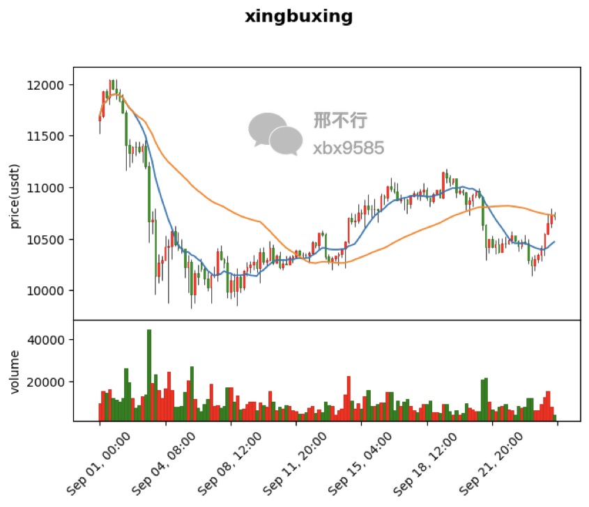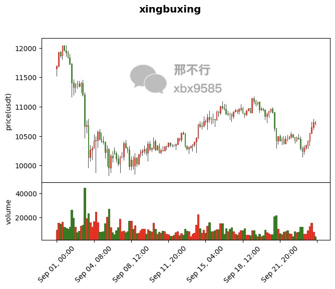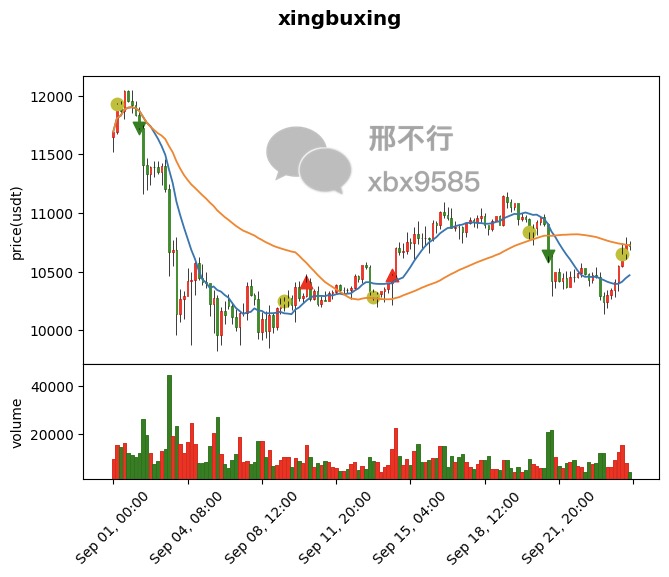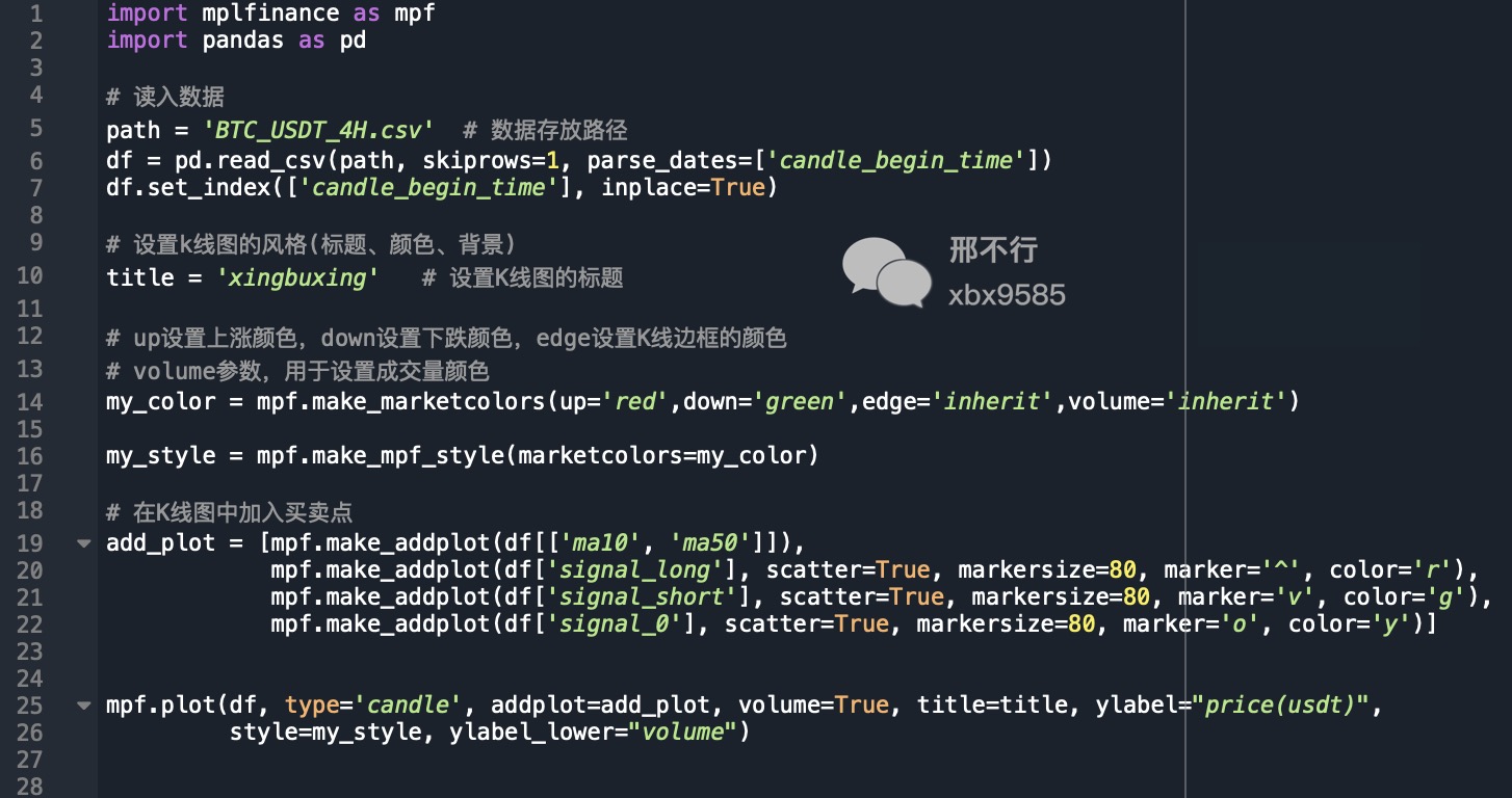现在我们已经成功绘制出比特币4小时K线,加入了成交量,均线,并且还把我们自己的交易信号添加到K线中。