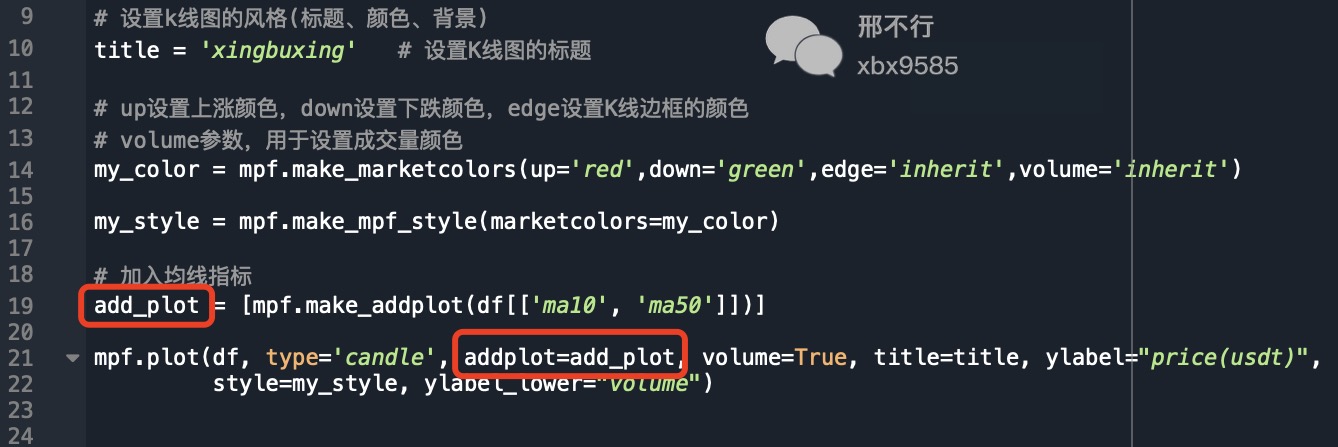 第19行新增一个变量add_plot, 赋值为10日均线’ma_10’和50日均线’ma_50’,并且将add_plot变量添加到第21行的mpf.plot()方法中。