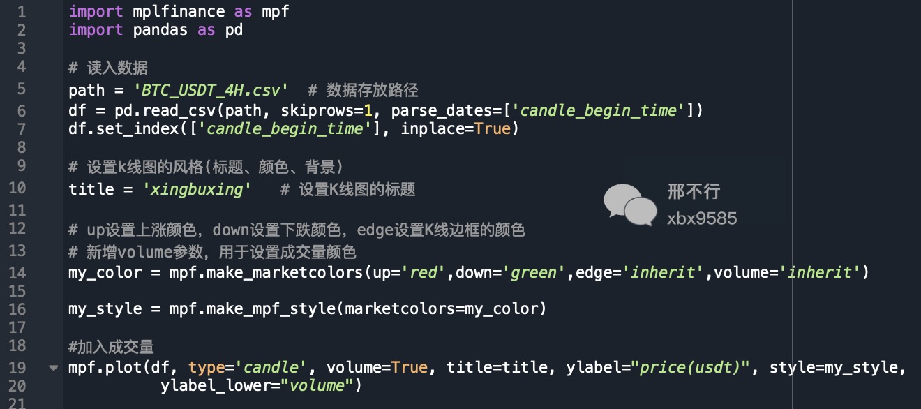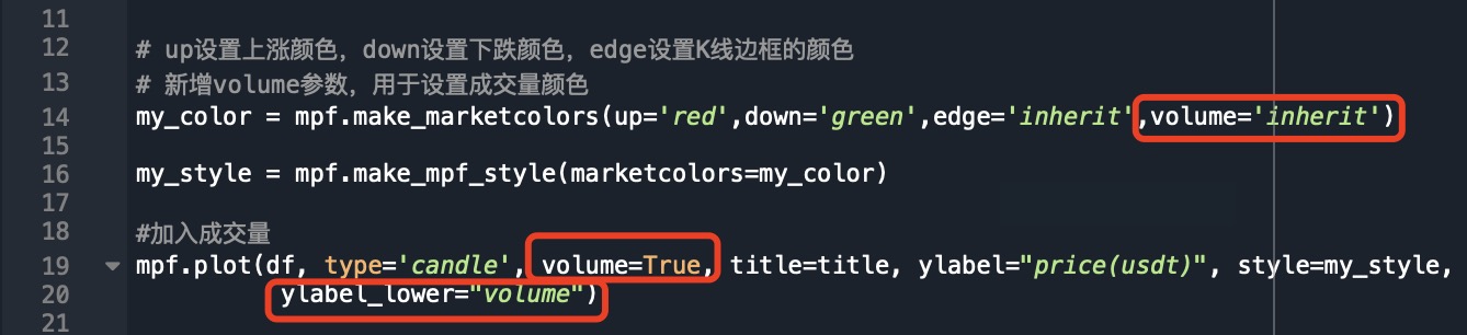 首先,在第14行新增了一个volume参数,volume=’inherit’意思是将成交量柱状图的颜色设置为红涨绿跌,与K线一致。