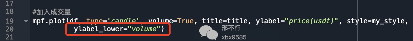 下方的柱状图表示成交量(红涨绿跌)想要修改成交量纵坐标的名称,只需修改代码第20行代码里的ylabel_lower参数即可: