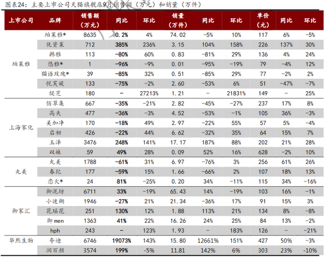通过观察我们发现,珀莱雅、华熙生物、丸美股份、上海家化这四家企业今年以来都在重点发力线上销售渠道,包括电商自营店、代理店和直播带货等形式。根据万联证券的数据报告显示,今年9月: