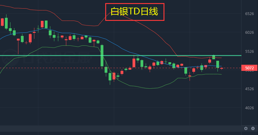 白银TD方面,白银TD日线昨日收取一根带下影线的实体阴柱后,晚间开盘,行情出现小幅反弹,上方阻力位在中轨5130附近,MACD金叉虽然在放量,但是开始递减;4小时线上布林带有向下开口发展的趋势,上方阻力位在中轨5170附近,MACD死叉形成并开始放量;小时线上布林带向下收口发展,上方阻力位在5100附近,MACD金叉形成并开始放量;整体而言,白银TD是大周期下跌,小周期反弹的趋势,上方阻力位在5100-5130,下方支撑在5030-5000,今日白银TD行情分析建议(个人建议,仅供参考,风险自担):