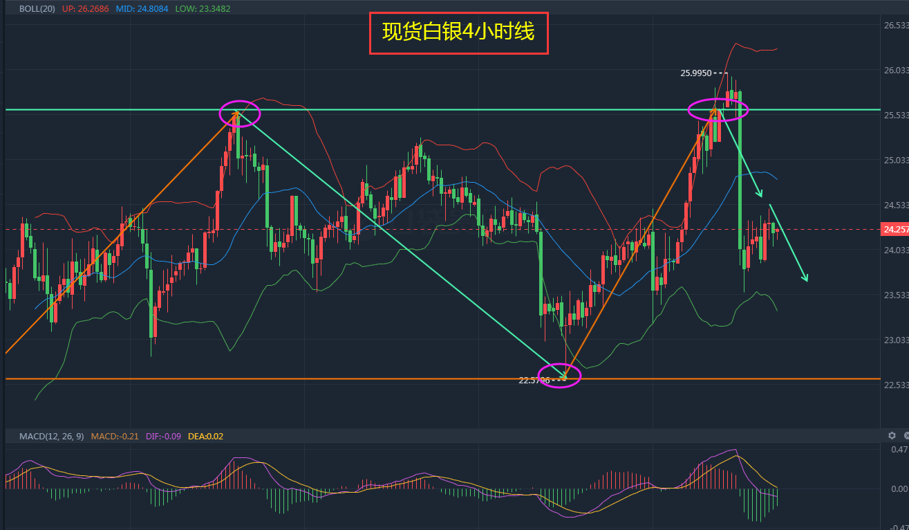 现货白银,现货白银昨日收取一根上影线长于下影线的实体小阳柱,但是实体在日线中轨之下,日线布林带有缓缓开口的趋势,上方阻力位在昨日高点24.5附近,MACD金叉小幅放量;4小时线上布林带向下开口发展,上方阻力位在昨日高点24.5附近,之后行情开始出现下跌,MACD死叉依旧在放量;小时线上经历上次大跌后,白银进入震荡收口阶段,上方阻力位在昨日高点24.5附近,下方支撑在24附近,MACD金叉小幅放量;整体来说,今日白银依旧是震荡下跌的趋势,上方阻力位在24.5-24.8,下方支撑在24-23.8;