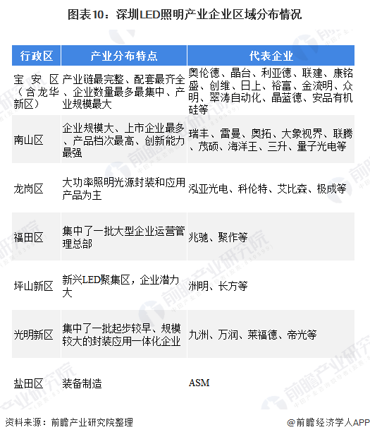 如宝安区(含龙华新区) 产业链最完整、配套最齐全、企业数量最多最集中,代表企业包括奥伦德、晶台、利亚德、联建、康铭盛、创维、日上、裕富、金流明、众明、翠涛自动化、晶蓝德、安品有机硅等。