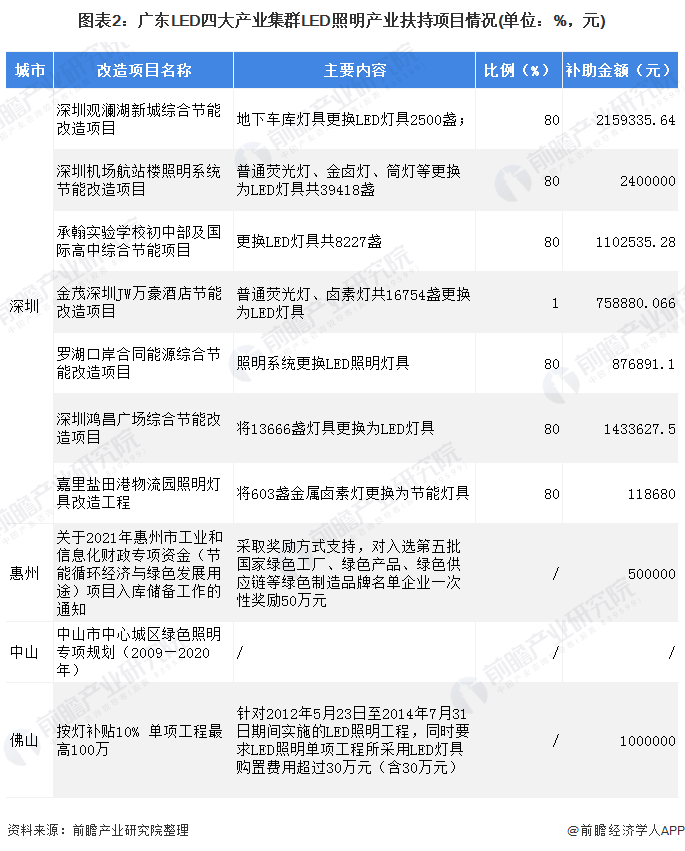 对于LED照明产业发展,深圳市通过资金补贴大力推动产业发展。2019年深圳市住房和建设局对深圳观澜湖新城综合节能改造项目、深圳机场航站楼照明系统节能改造项目、深圳鸿昌广场综合节能改造项目、嘉里盐田港物流园照明灯具改造工程等项目扶持中均涉及LED灯具更换,推动LED产业规模发展,并且补助金额庞大,根据项目涉及范围补助金额在几十万到上百万不等。