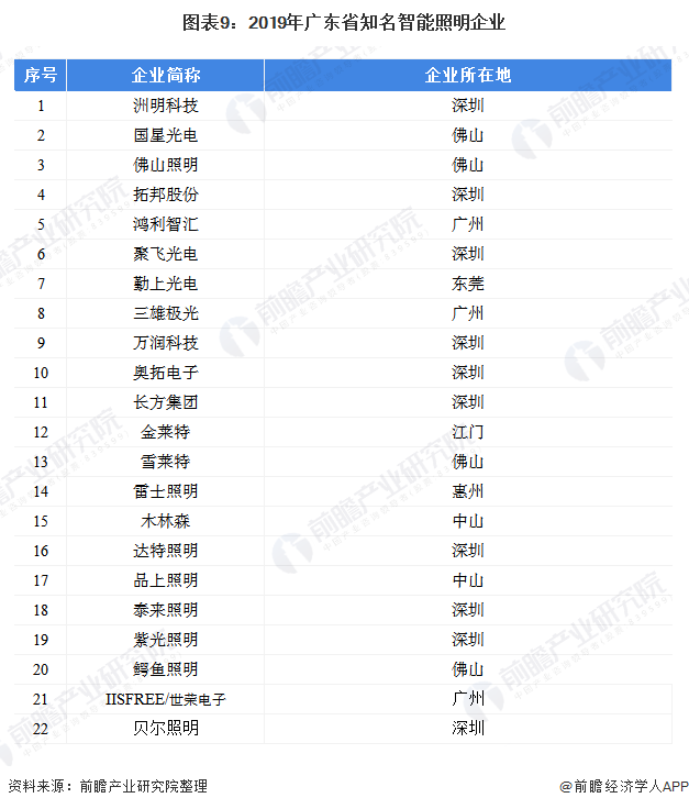 深圳市多家LED照明企业寻求产业升级,发展智能照明。2019年5月,互联网周刊发布了《2019智能照明企业排行榜》(TOP50),广东省有22家上榜企业,其中深圳有10家企业在榜,企业数量接近一半,在广东省居于首位。