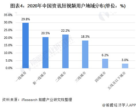 我国资讯短视频用户较多分布在一二线城市,根据iResearch公布的调研数据显示,我国资讯短视频用户中,三线及三线以下城市用户占比仅为27.5%,一线城市用户占比达到近三成,资讯短视频下沉市场仍有较大的发展空间。