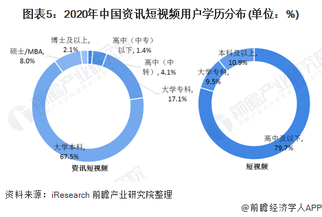 根据iResearch公布的调研数据显示,我国资讯短视频用户中,本科及以上教育水平用户占比达77.6%,其中大学本科用户占比为67.5%,硕士/MBA用户占比为8%,远高于短视频用户中本科及以上用户占比(10.9%),总体来看资讯短视频用户对内容的要求较高,侧面反映资讯短视频平台要想留住用户,需要加强内容创作水平。