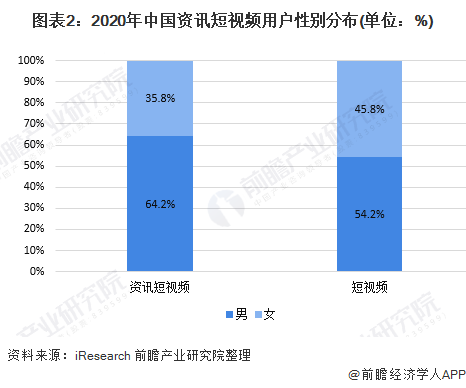 从用户性别分布来看,根据iResearch公布的调研数据显示,我国资讯短视频用户中,男性用户占比达64.2%,相较于泛娱乐短视频(男性用户占比54.2%),资讯短视频的用户男性占比更高。